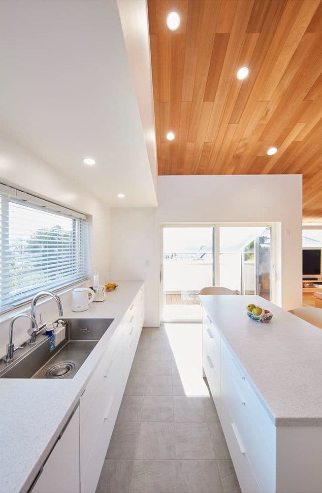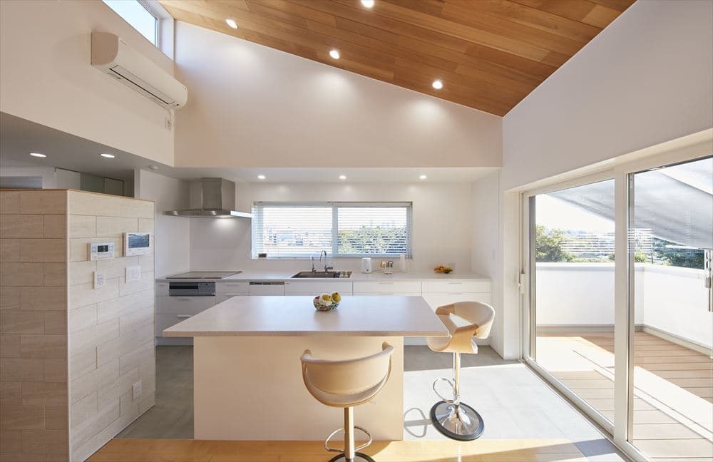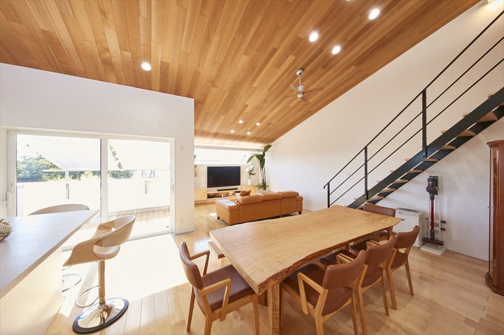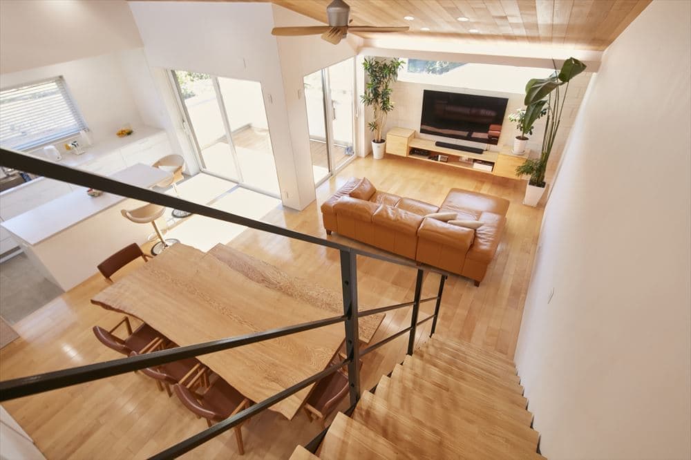 2階リビングは無垢の板を貼った勾配天井で、広々としたとても開放的な空間です。白に統一された奥様のこだわりのキッチンハウス製のオーダーキッチンに、洗練された家具がとてもセンス良く配置されています。収納場所として設置したロフトに上るストレート鉄骨階段もリビングの空間にアクセントとなっています。