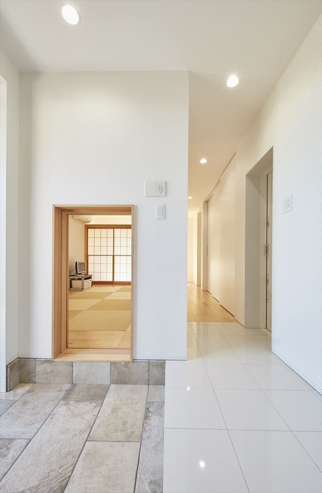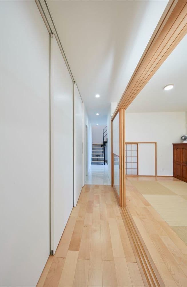 ご夫婦2人でゆったりと暮らせるようにと、1階はビルトインガレージに客間と水回り、2階には開放的なLDKと寝室とロフトのある間取りです。玄関を開けると目に入る鉄骨のスケルトン階段も特徴的です。
