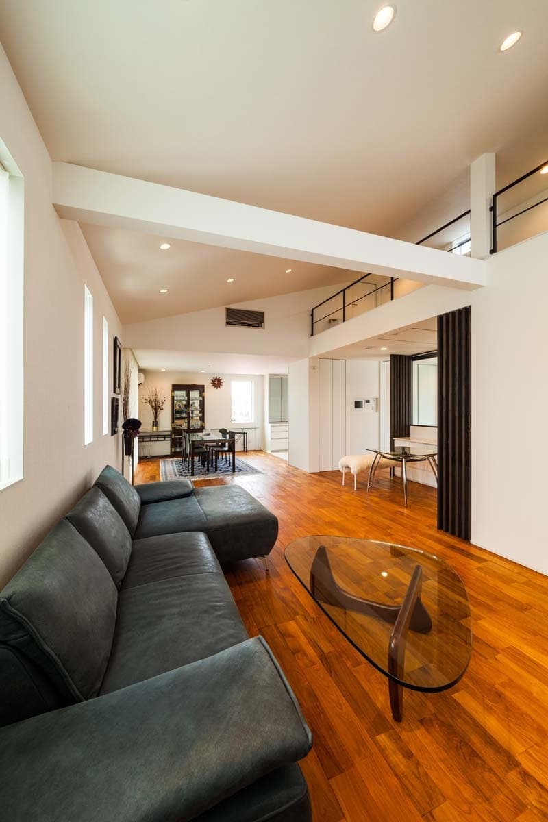 2Fのリビングは勾配天井で縦にも横にも開放的な空間となっています。ナチュラルなオークの無垢床と白い壁が落ち着いたテイストを醸し出しています。