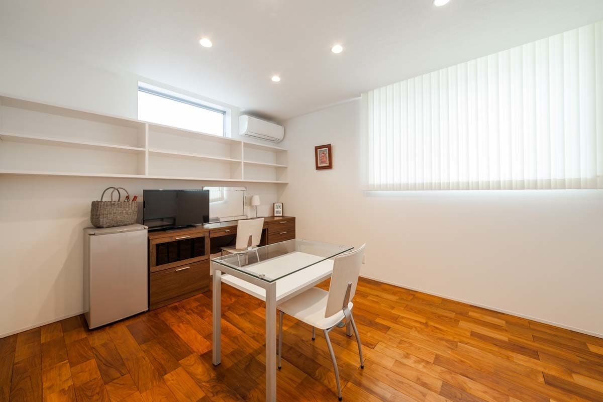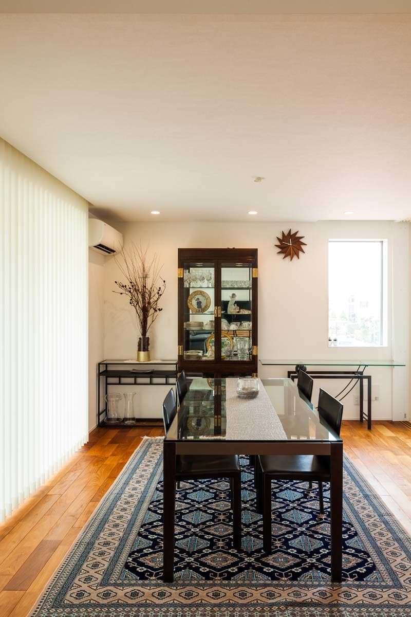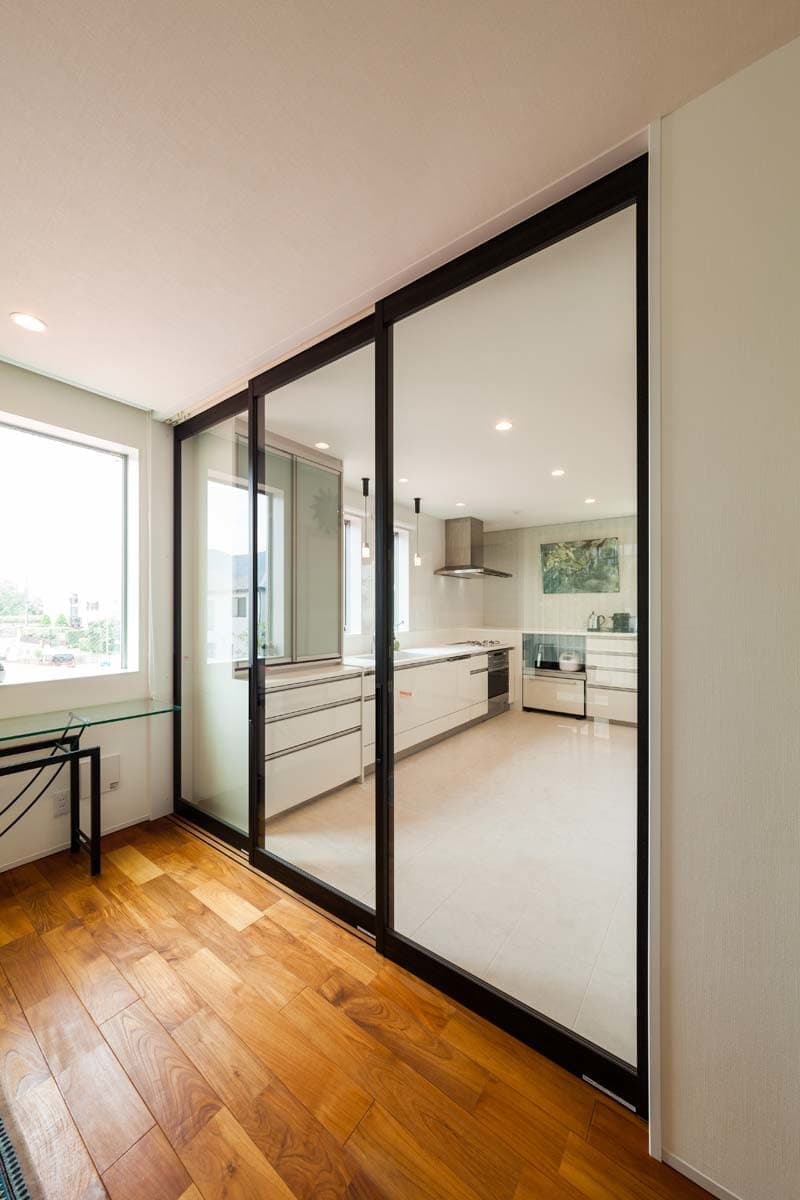 キッチンとリビングはガラス張りの建具で仕切られているので、料理をしながら生活も感じつつ、奥様が集中して料理をできるような工夫もあります。