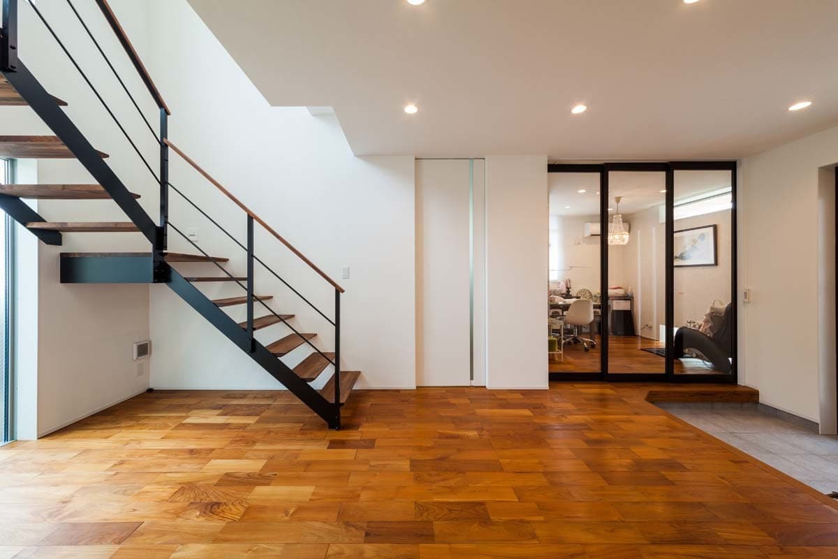 1Fのホールも同様にガラスの建具で仕切られた奥様の仕事場と、オープンな鉄骨階段に大きな開口窓から差し込む光で魅力的なスペースとなっています。