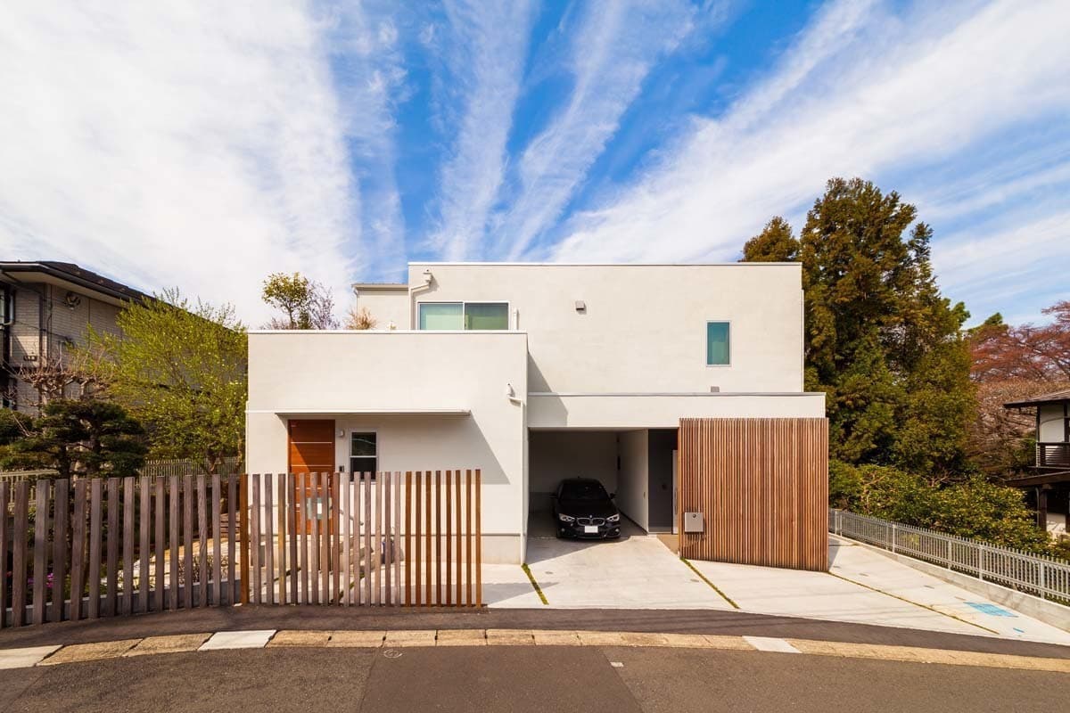 外観は、ウッドフェンスや木の格子がシンプルな外観に色合いを深めています。