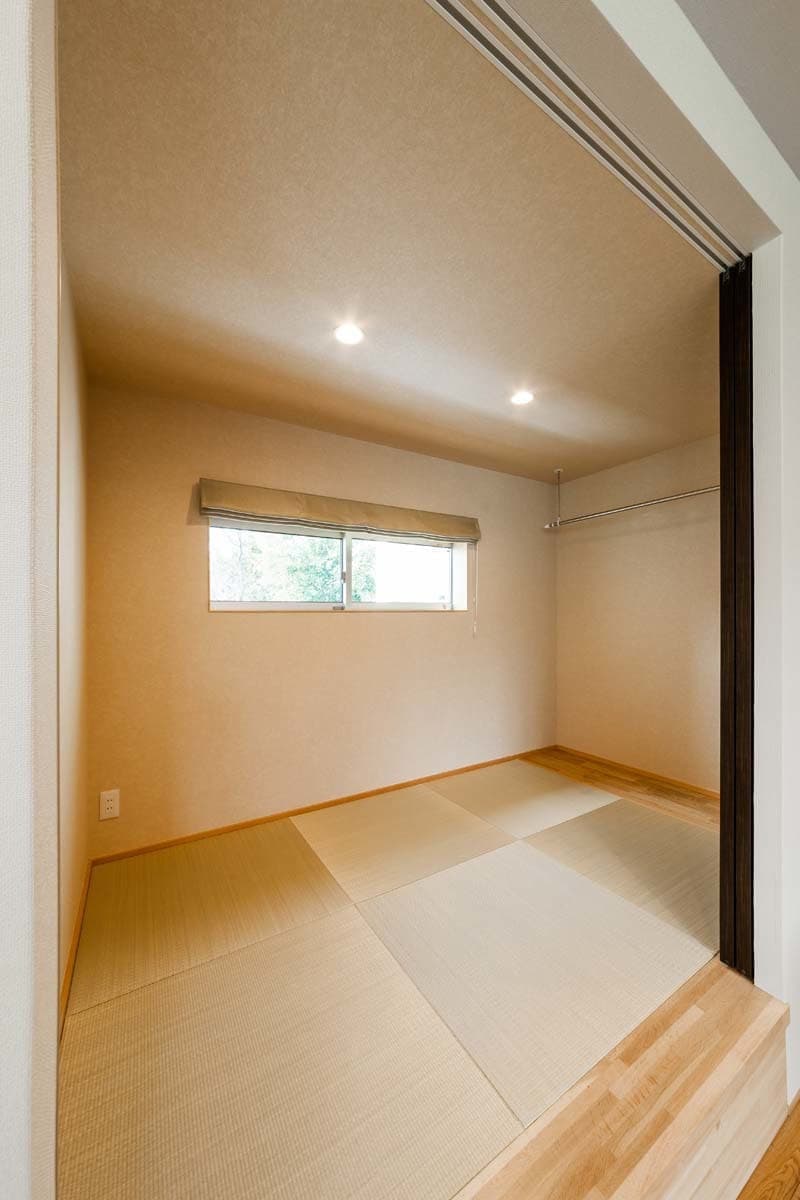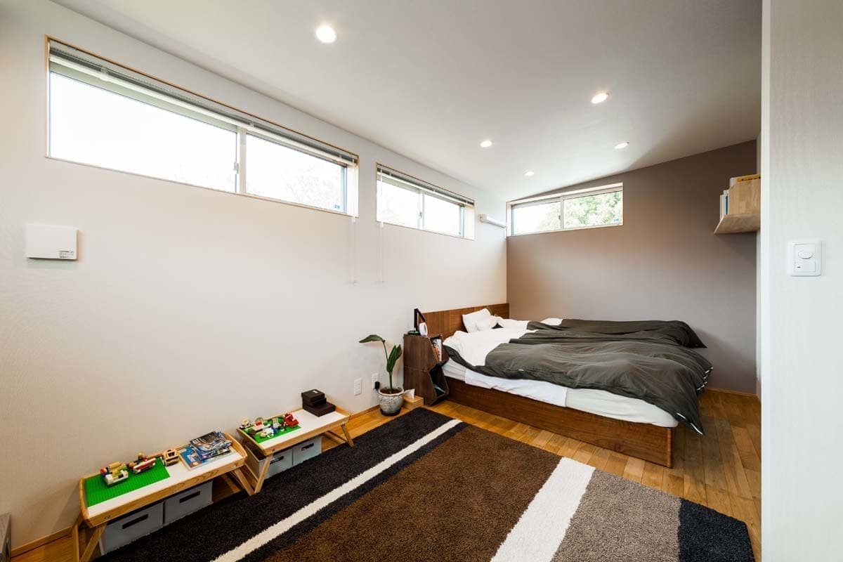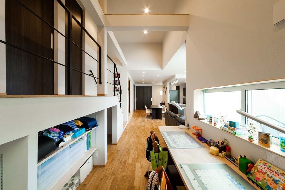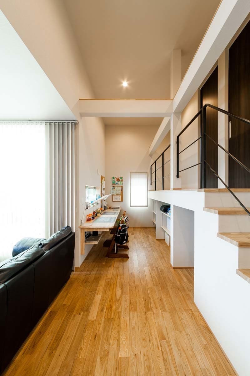 1Fと2F子供部屋との間を広い収納スペースにして、その分をリビングからスキップフロアとなっているので、高い天井高が実現して空間の変化を感じる提案でもあります。