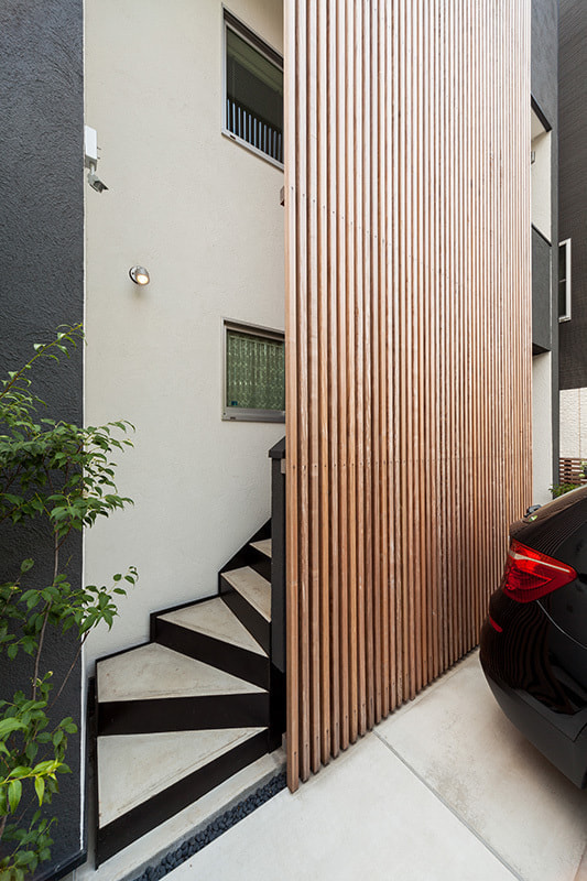 正面の外観はすっきりとシンプルながら、木製の格子を貼ることで素材感も感じるMDAらしいファサードです。