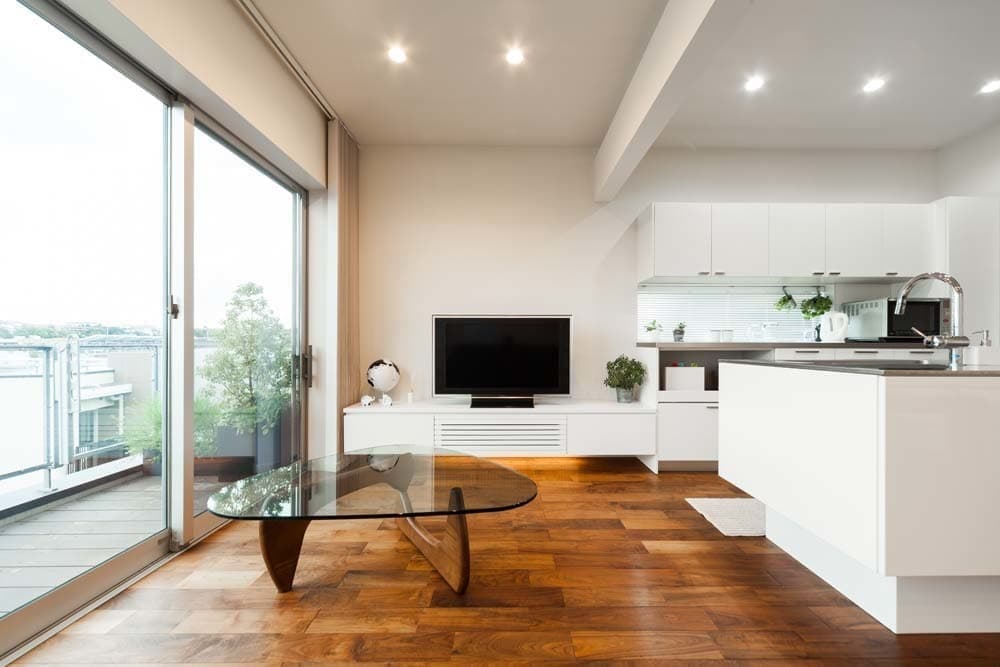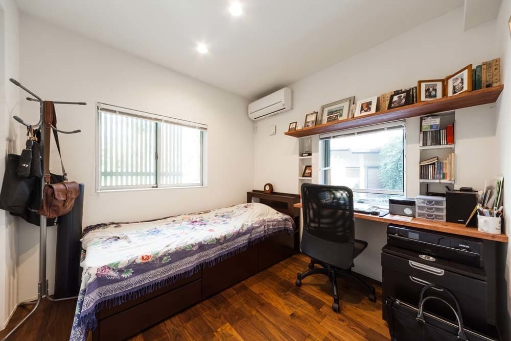 3Fの子世帯のリビング。落ち着いた無垢の床にシンプルにデザインされた造作家具が似合います。