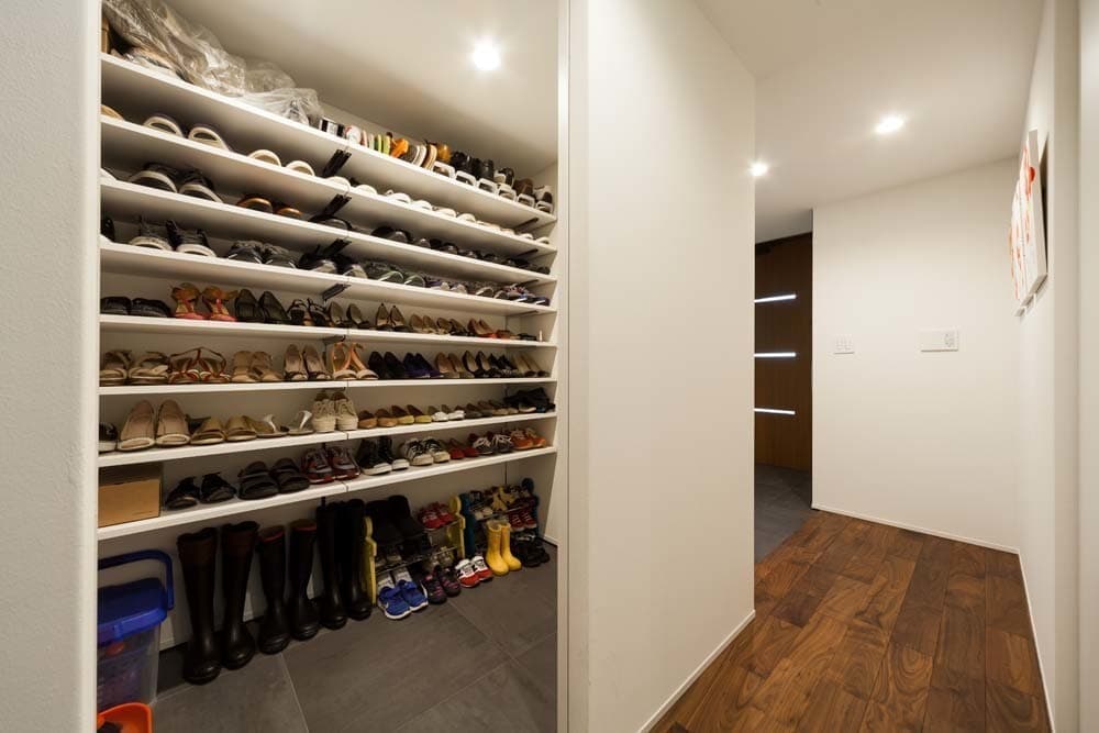 Fの子世帯の玄関のシューズボックス。造作で家族全員の靴も収納できます。