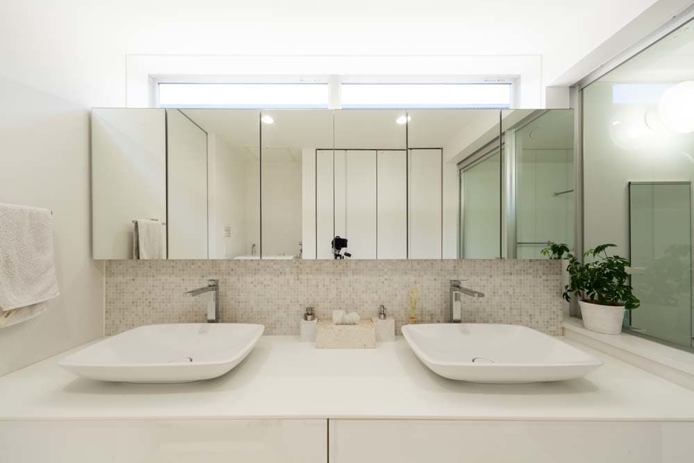 奥様こだわりの洗面台。2つの洗面ボウルはドイツのビロイ&ボッホ製。鏡や収納はオリジナルでデザインしました。