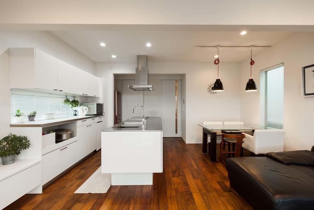 3Fは子世帯のリビングで、ペニンシュラ型のキッチンを中心に洗面台へぐるっと回れるように家事動線も考えられています。