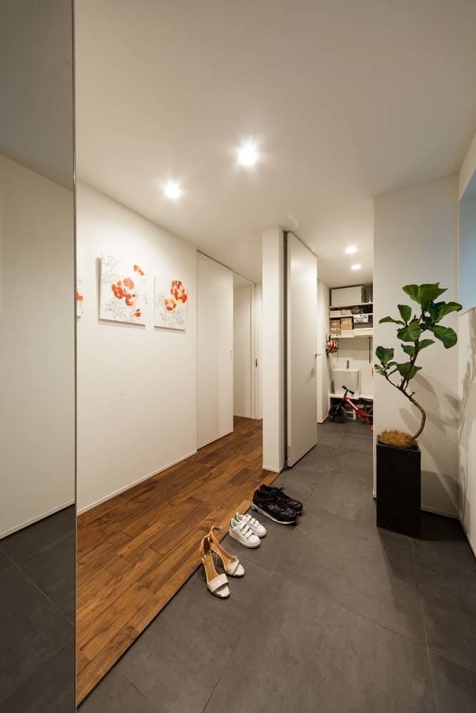 子世帯の玄関。建具は天井までの高いドアなのですっきりしてます