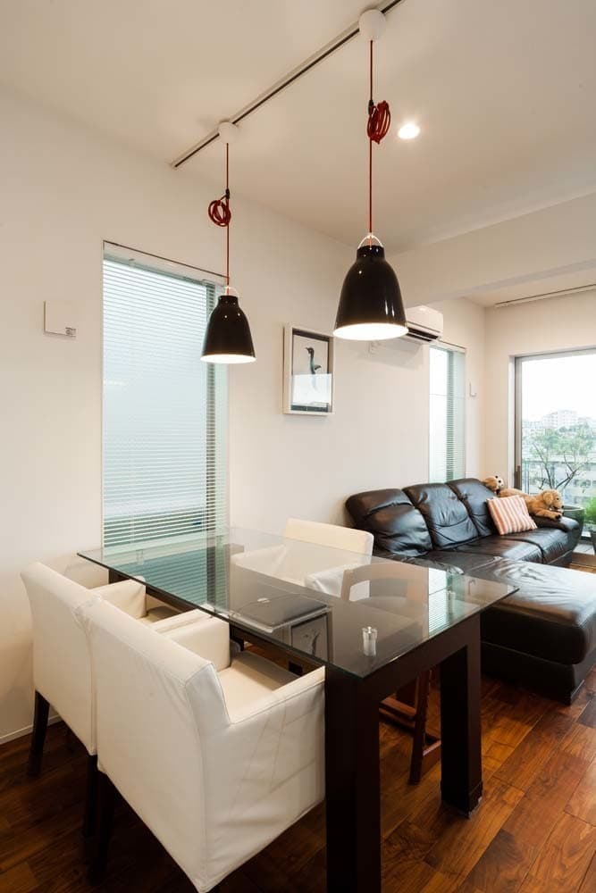 ダイニングテーブルも吊り照明もおしゃれなデザイン。