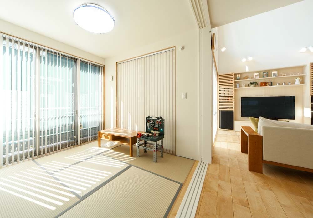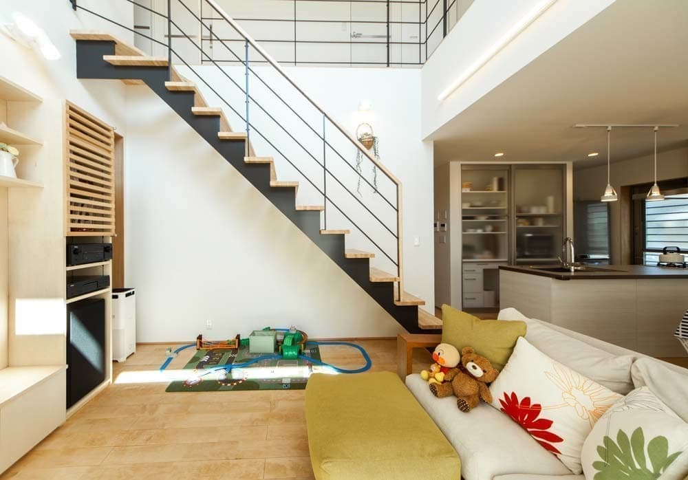 また、リビングの壁面一体のTVボードやキッチンの収納などお施主様の好みに合わせてすっきりとデザインしたオーダーメイドも提案もMDA円徳建工らしいテイストに仕上がっています。
