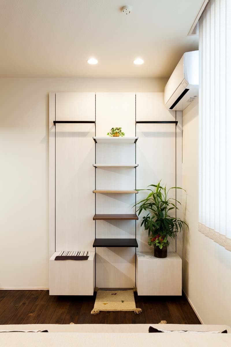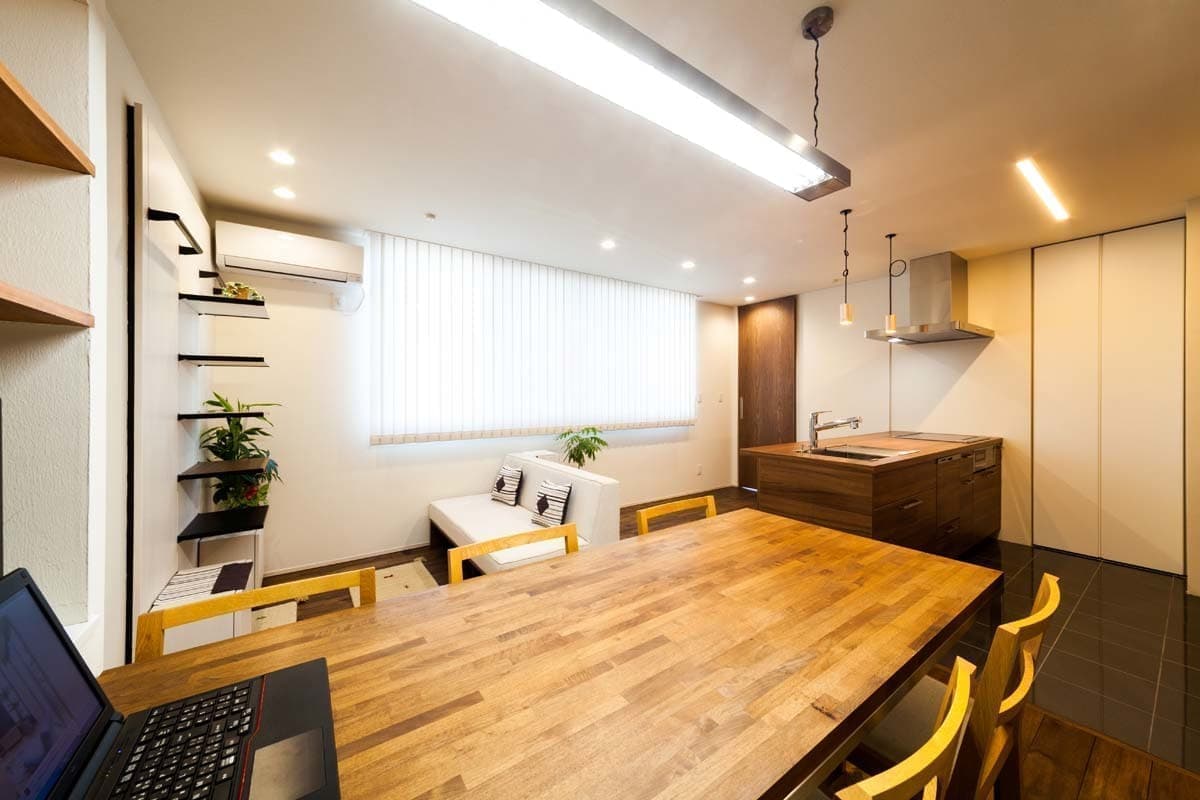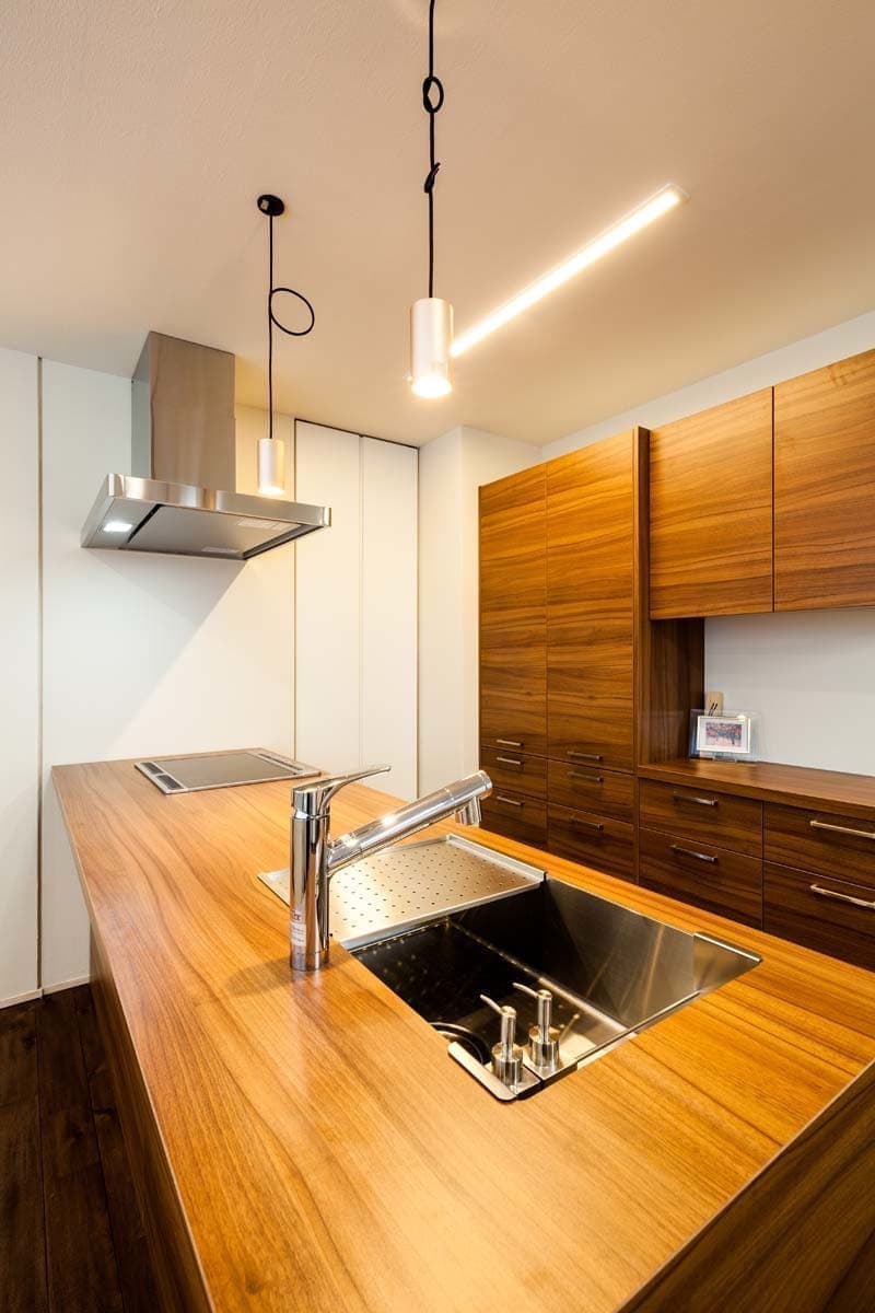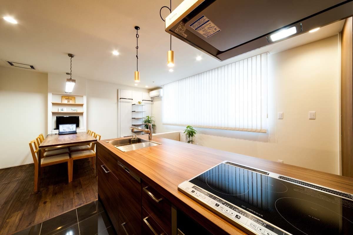 無垢材のフローリングや珪藻土の塗り壁に囲まれたナチュラルなテイストの空間に、MDAの標準仕様のキッチンセットやフルハイトドア建具なども設置された、まるでリビングダイニングキッチンのような空間です。